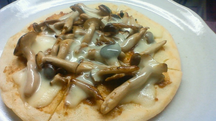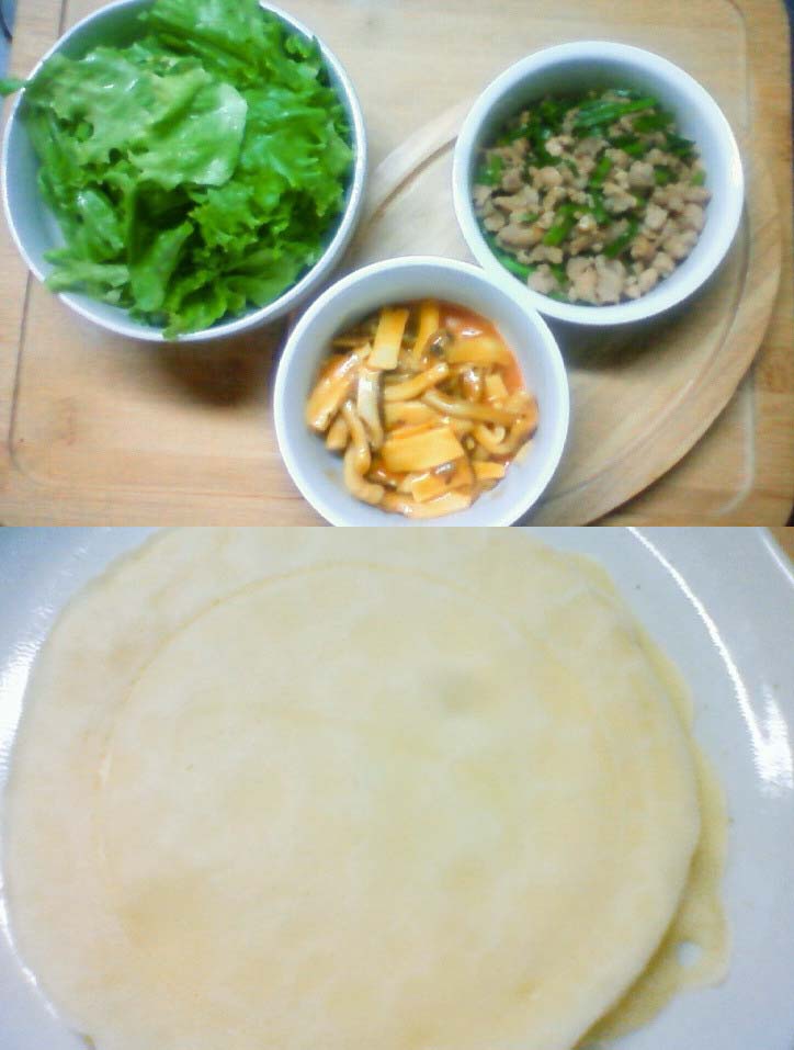 ピーマン味噌で作った肉味噌ときのこの具を作ってレタスを用意。クレープ生地を焼いて・・・