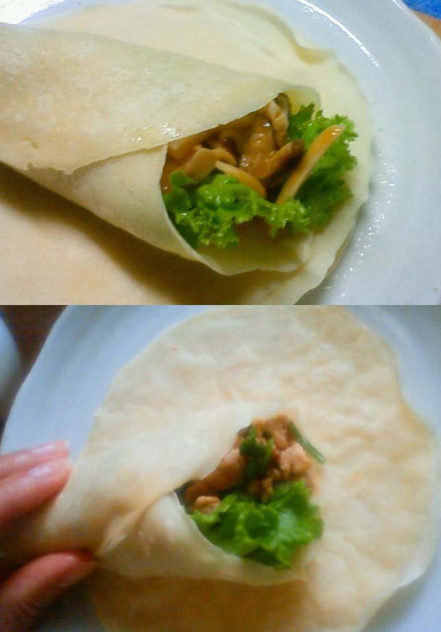 クレープ生地にィ~ピーマン味噌ちょっと塗って~レタスのっけて~具材のっけて~