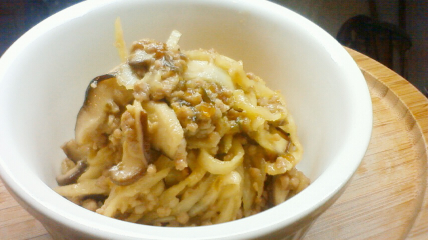 挽肉と切干大根・椎茸をピーマン味噌で炒めました
